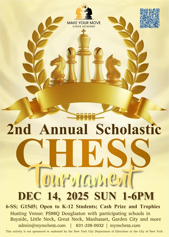 Register: https://mymchess.com/tournament-events/mym-2025-year-end-cross-school-uscf-tournament/ Cross School Scholastic USCF Tournament Live PAIRING/result: MYMChess Pairing / Standing Link Location: Hosting School: PS98 Cafeteria 40-20 235 Street, Douglaston, NY 11363 Waiting Area for parents in Auditorium Plenty of street parking Details: This is a USCF Event a USChess ID is required to register.($20/year for youth member) https://new.uschess.org/join-us-chess All registration must […] |