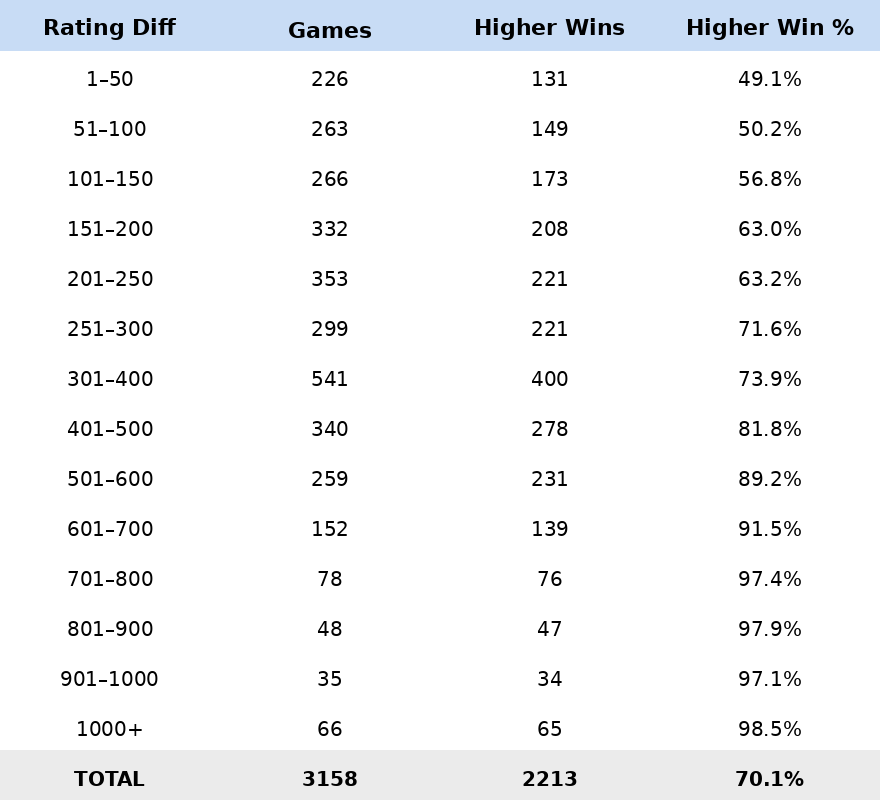 Depends on the number: As you’d expect, the larger the rating difference, the more likely the higher-rated player is to win. But even within a 150-point gap, the higher-rated player’s chances are only slightly better than a coin flip. And when the difference balloons to 301–400 points, the lower-rated player still won more than 25% of the time at the Metros – a striking reminder of how unpredictable scholastic chess can be.