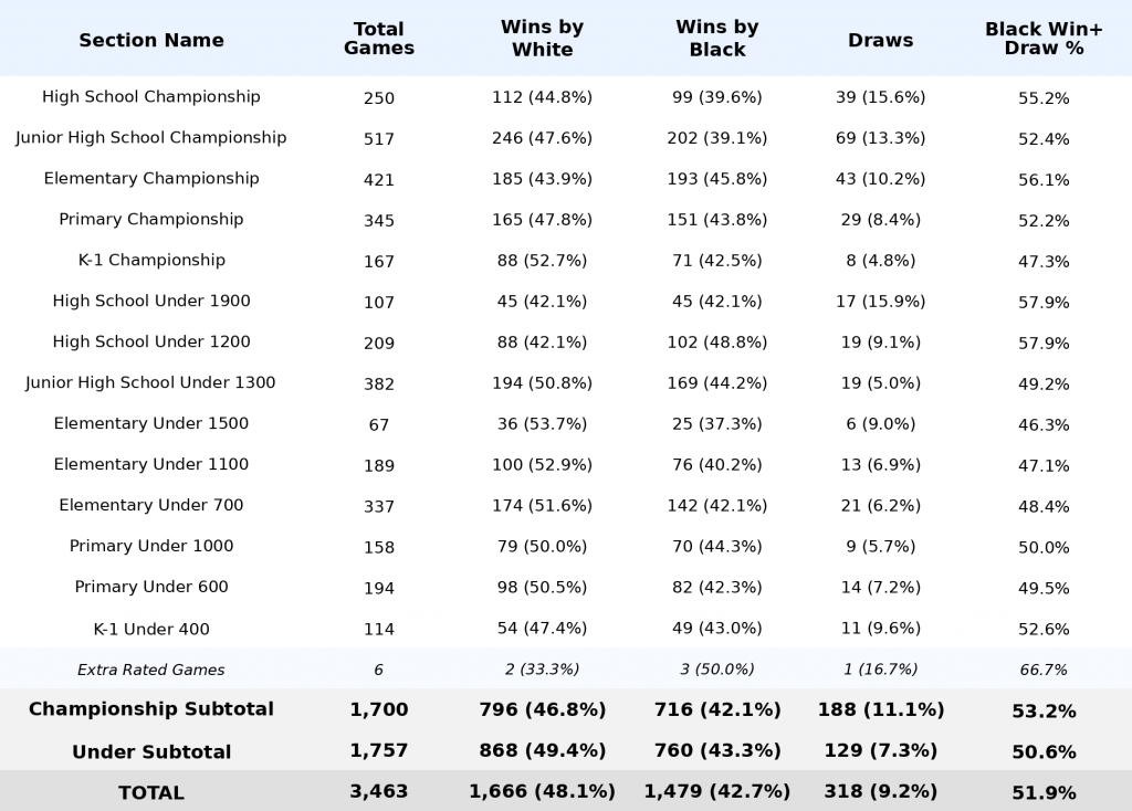 However, in the older and higher-rated fields (specifically the four highest Championship sections (excluding K-1) and all High School Under sections), Black managed to achieve at least a draw in over half of all games, indicating that stronger defensive technique and preparation materially compress first-move advantage.