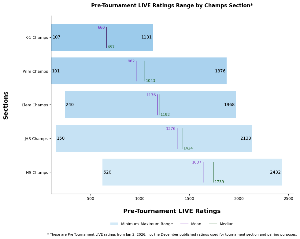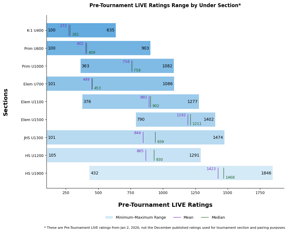 The overall mean rating of the tournament field was 958 (938 median), based on LIVE ratings as of Jan 2, 2026, reflecting a healthy mix of developing and advanced players.
